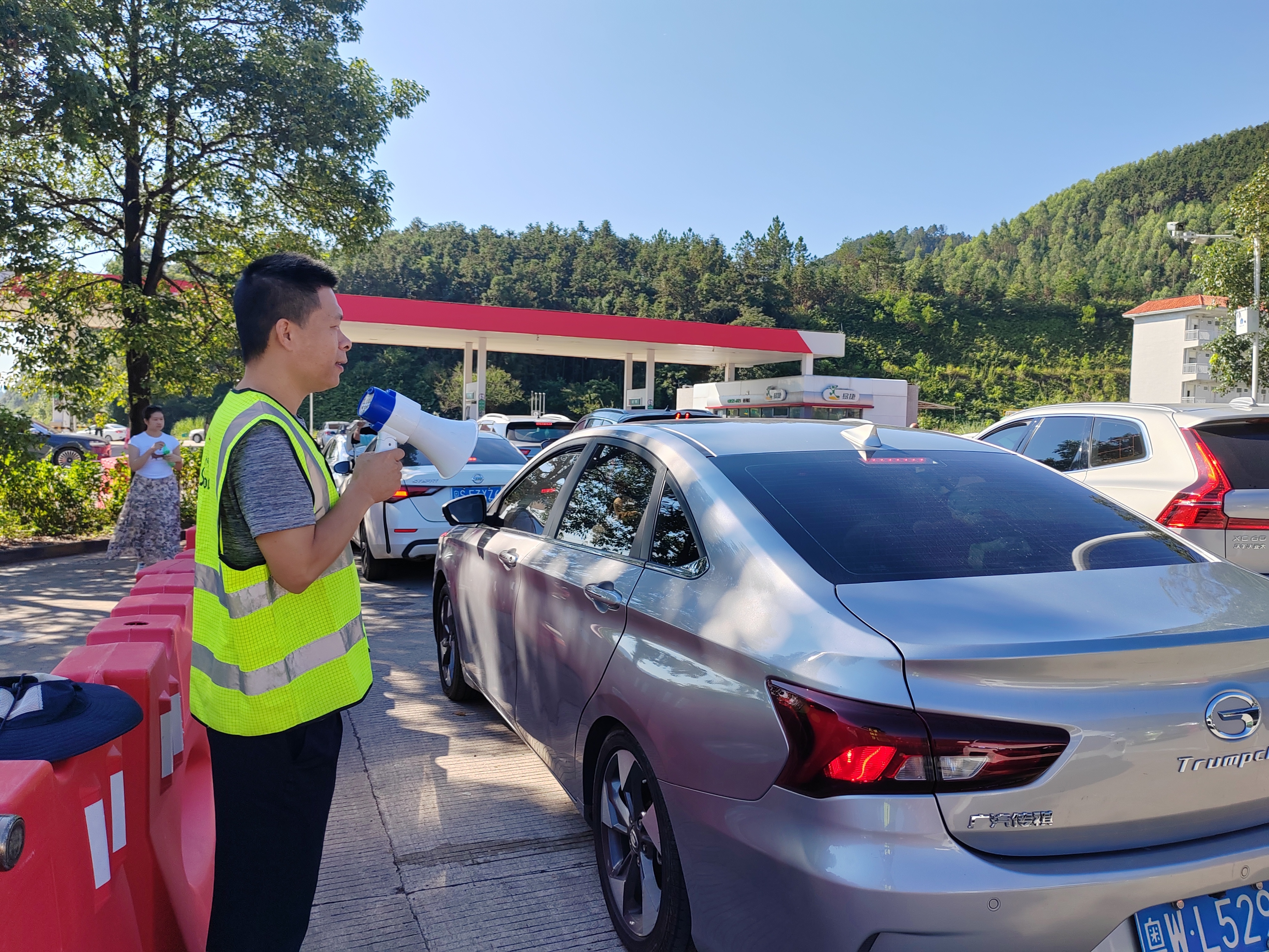 △二广高速连山南服务区,志愿者陈荣灿拿着扩音器疏导交通。