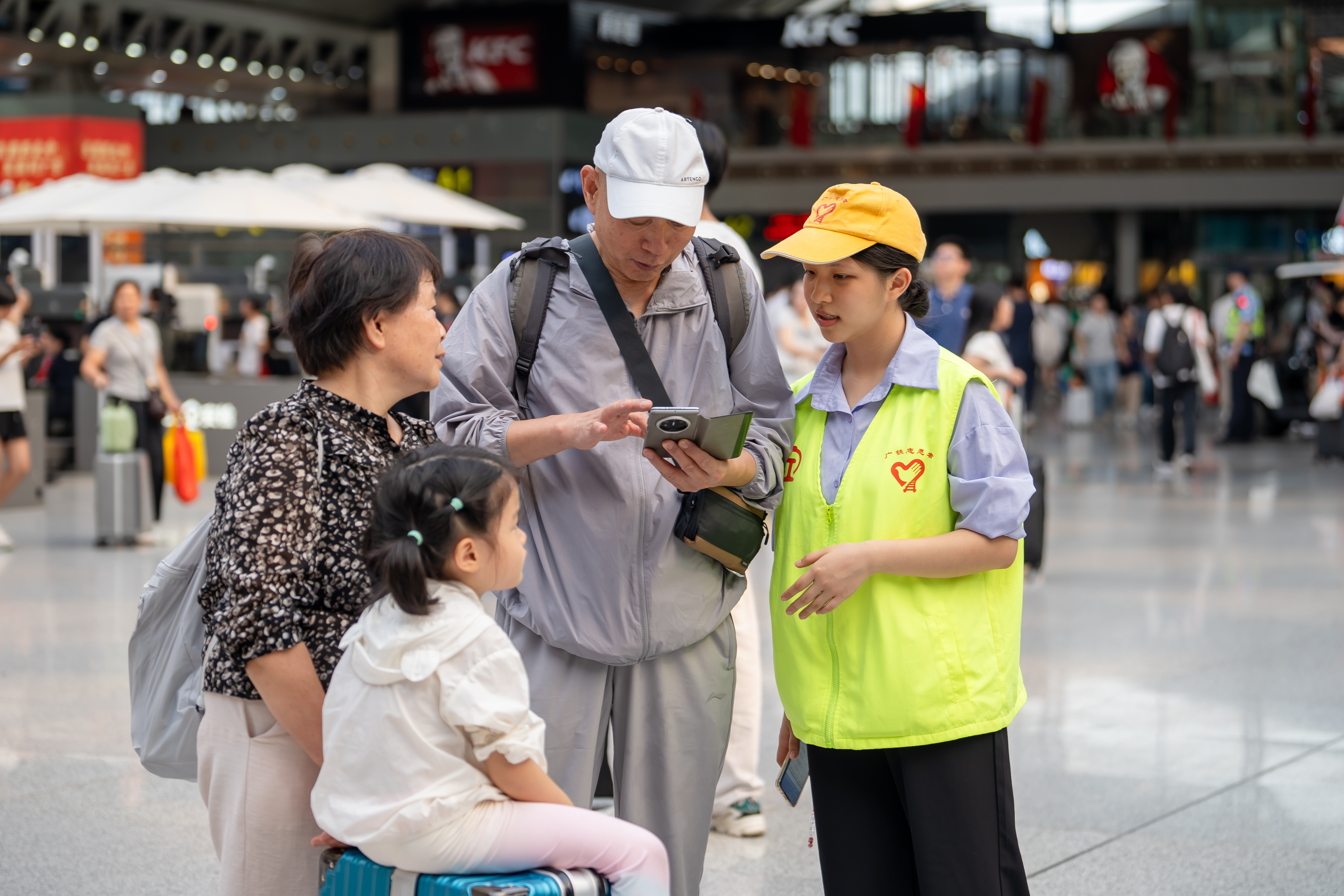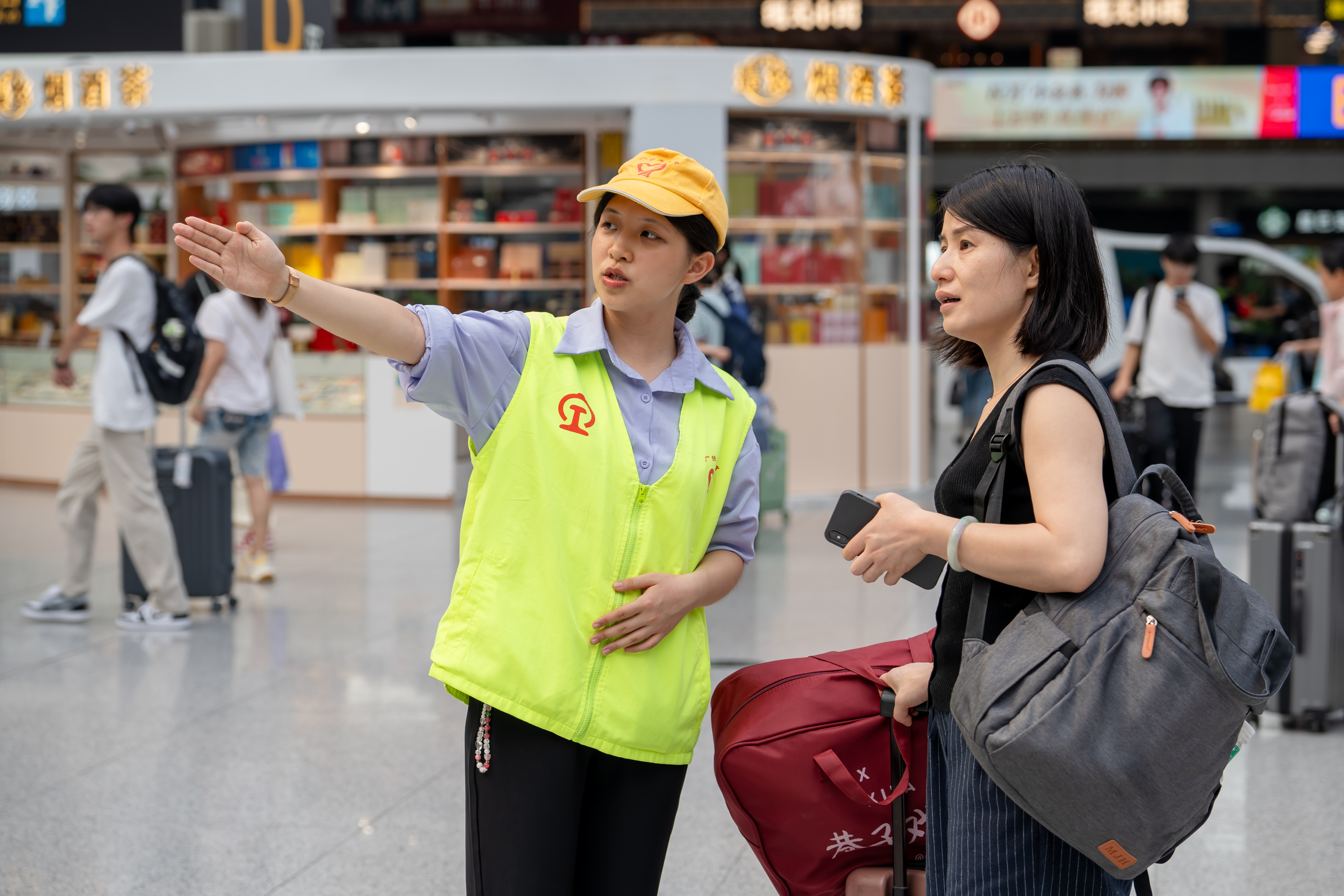 “我们早上7点就来站内熟悉点位了,还提前备好了矿泉水,就是想在客流高峰前做好准备,让大家的返程路更顺畅。”陈慧琪说,希望为归家的旅客们带来了暖心的服务,让旅途更舒适、更温馨。