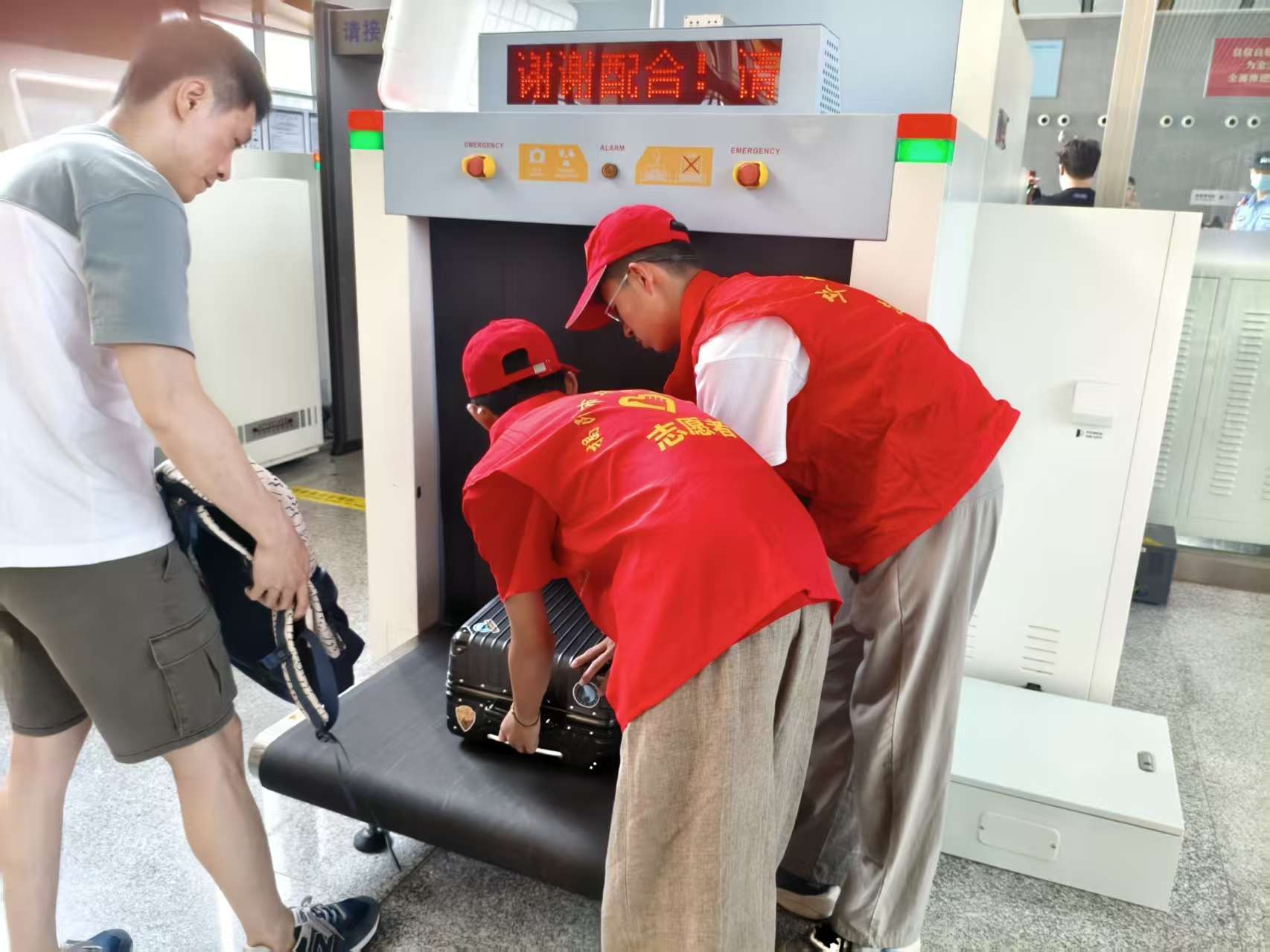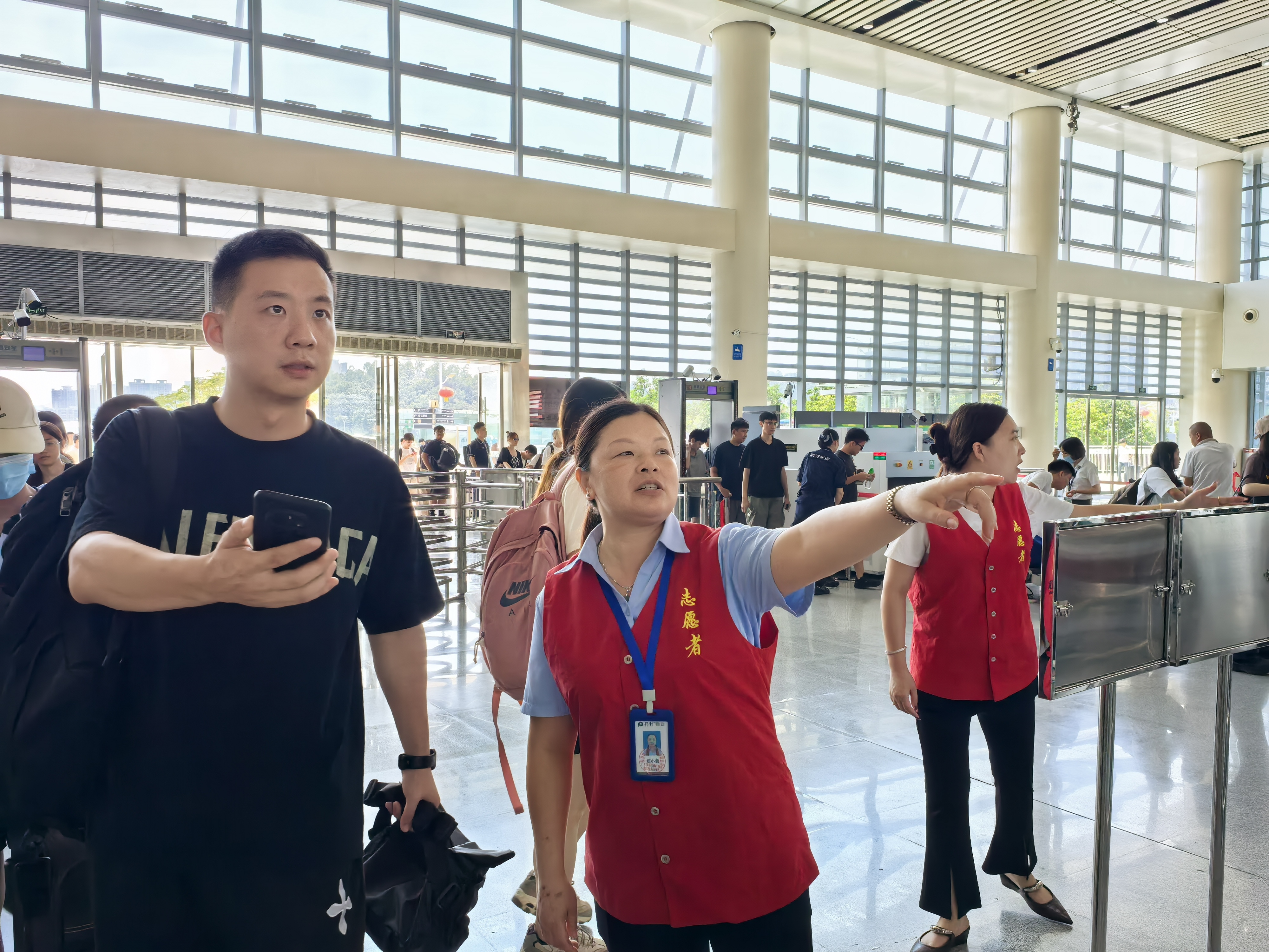 △揭阳站内,志愿者为旅客提供暖心服务。